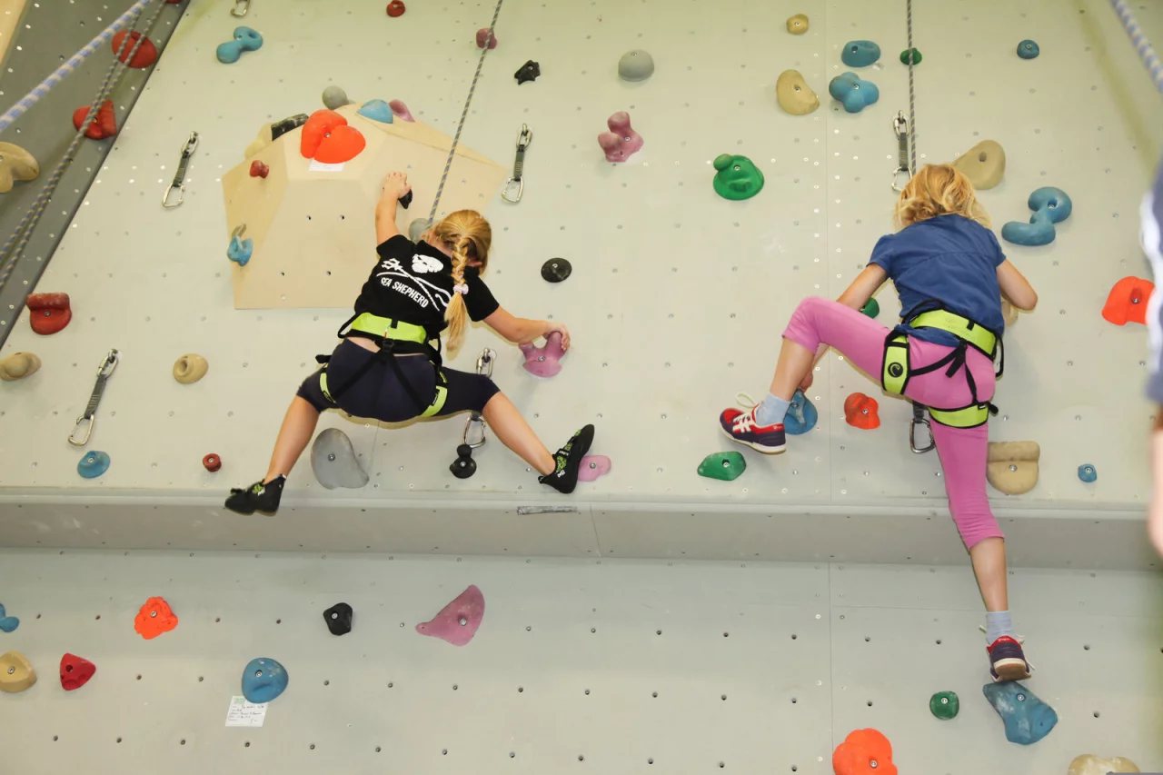 In Zweiergruppen geht es nach dem Aufwärmen an die Wand: „Wenn die Kinder schon soweit sind und sich gegenseitig sichern können, haben auch die Eltern die Möglichkeit, hier zu klettern“, erläutert Sebastian.