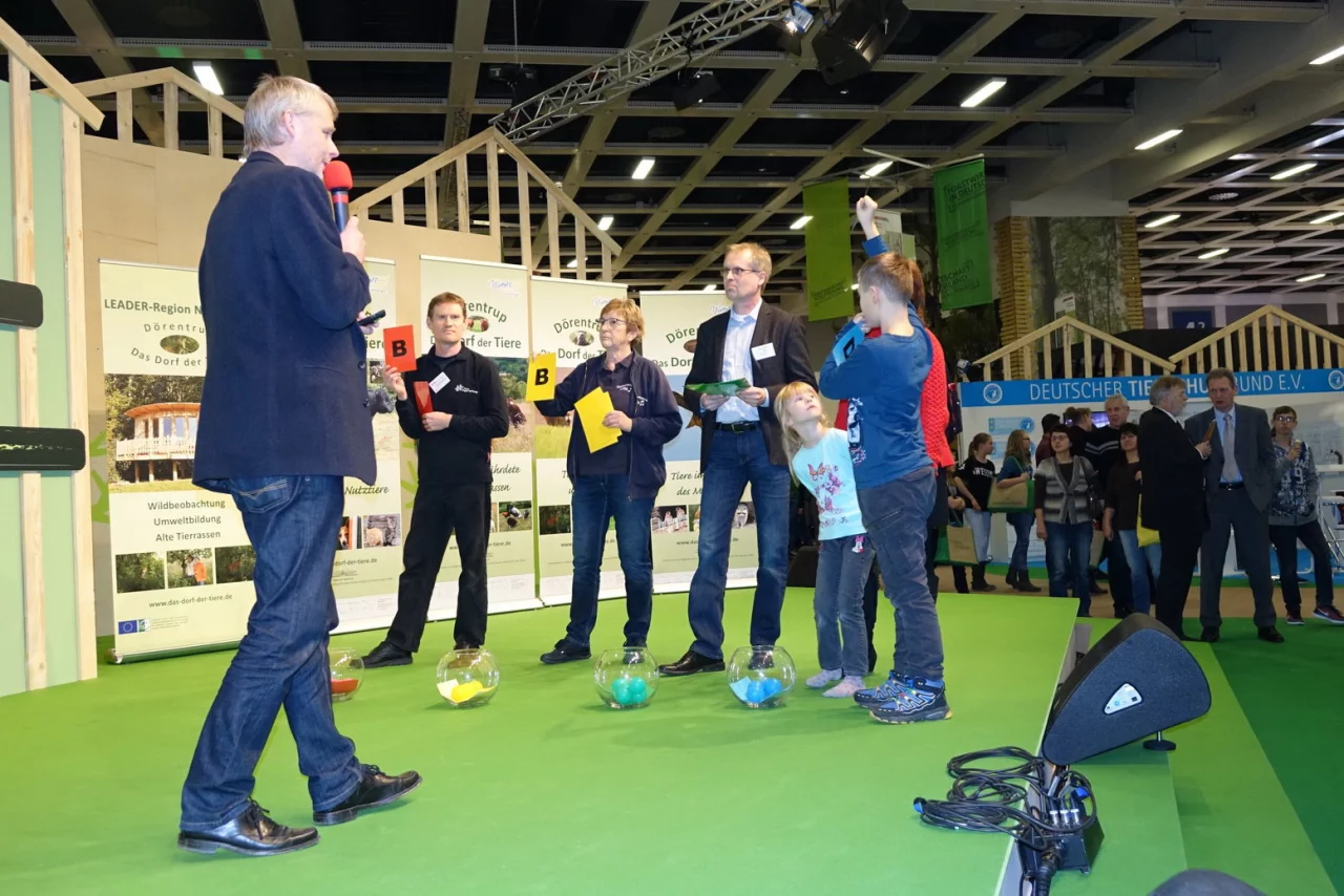 Moderatorin auf der Bühne war MDR-Journalistin Petra Schwarz. Nach einem Interview zu Dörentrup „fischte“ Diekmeier dann im Publikum erfolgreich nach Kandidaten für ein Dörentrup-Quiz, bei dem Katinka Kädtler, stellvertretende Vorsitzende von „Tiere im Dorf“, die Punkte vergab. Auf der Messe hat es laut Diekmeier auch Kontakt zu Dr. Michael Schaloske, Referatsleiter im NRW-Landwirtschaftsministerium, gegeben.