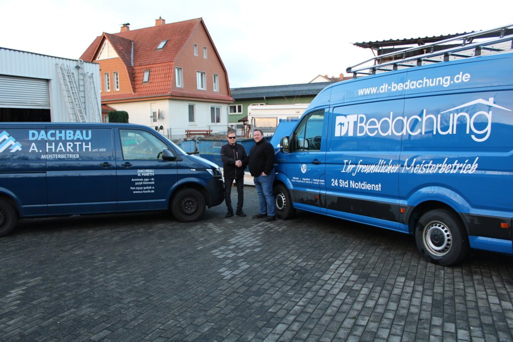 Augustdorf/Detmold. Eiskalt ist der Morgen in der Detmolder Arminstraße. Auf dem Hinterhof des Dachdeckerbetriebs A. Harth, geführt von Manfred Cremer, haben sich der Inhaber und Dirk Trakies zu einem besonderen Moment getroffen. Dafür sind auch die Firmenbullis der beiden Dachdeckermeister in Position gefahren worden, damit fotografisch der symbolische Augenblick der Übergabe festgehalten werden kann.