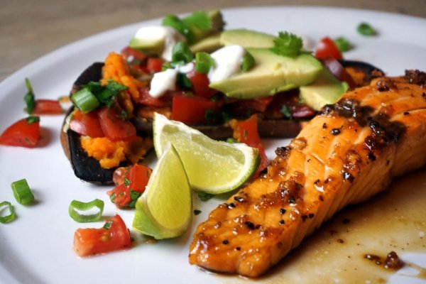 Rezept für bunte Süßkartoffel mit Teriyaki-Lachs