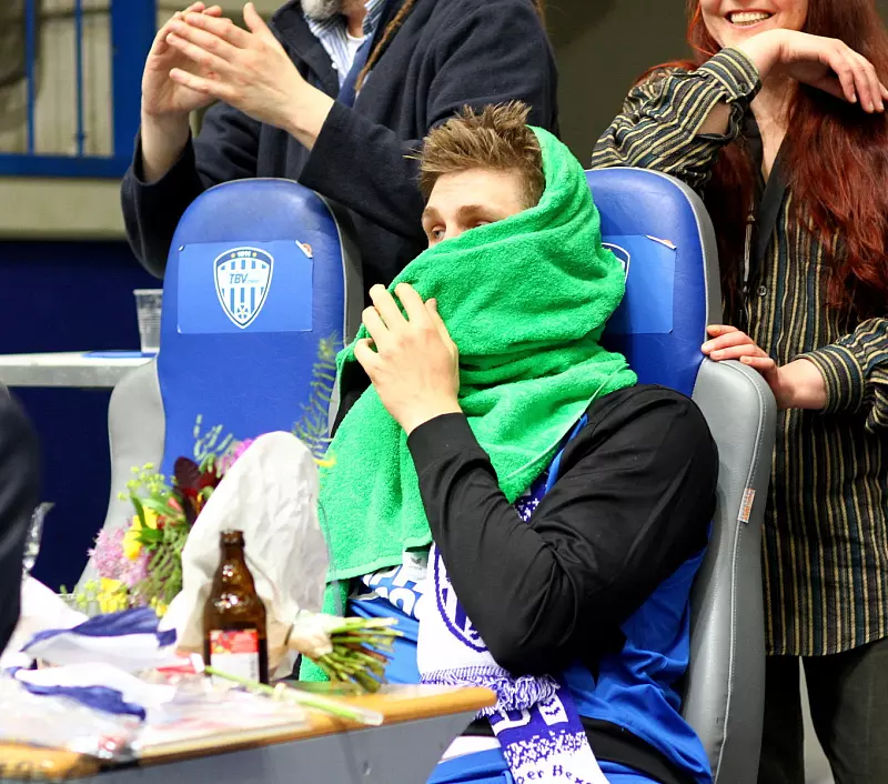 Die Erleichterung war riesig. Abzulesen an der Rührung von Florian Kehrmann, der sich regelrecht verkrümelte, als Rolf Hermann nach dem Schlusspfiff das Mikrofon ergriff. Statt des üblichen Dankeschön-Plakates hatte sich der TBV-Kapitän entschlossen, einige persönliche Worte loszuwerden. Sein besonderer Dank galt dem Trainer, der großen Anteil am Klassenerhalt habe, sowie „einem fantastischen Publikum“.