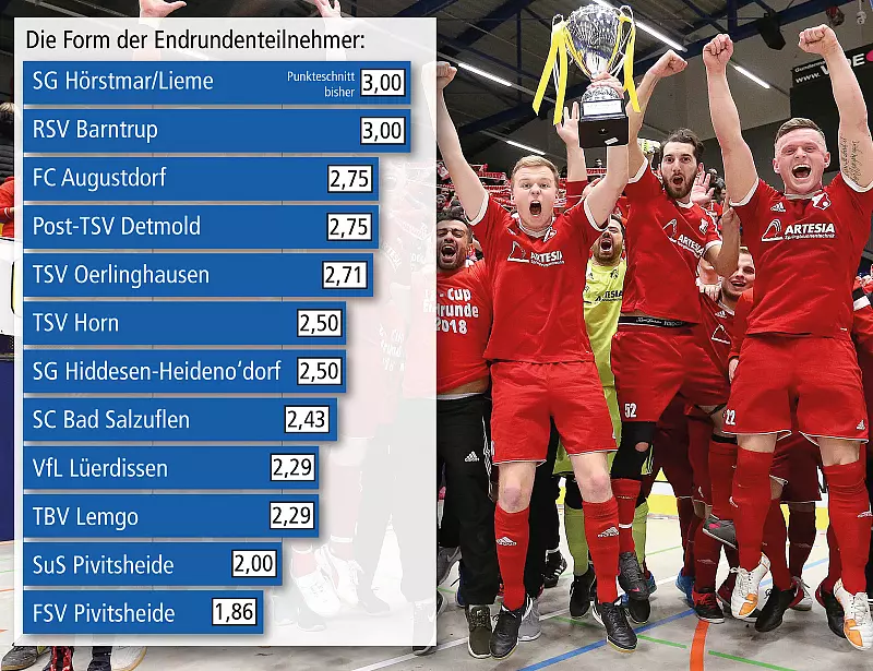 Die LZ bat im Vorfeld seine Experten Roland Szymkowiak (47) und Michael Krügel (53) sowie Endrunden-Moderator Andreas Schlingmann (51) um ein Ranking. Zwölf Punkte bedeuteten Topfavorit, ein Zähler krasser Außenseiter. Szymkowiak und Krügel gaben den Postlern die Höchstpunktzahl, Schlingmann „nur" elf Zähler. „Detmold profitiert von seiner Erfahrung, auch beim Futsal. Die Laufwege der Felker-Brüder Johann und Alexander – sie haben schon ’was", findet Krügel, Trainer der SG Bega/Humfeld. Szymkowiak, Coach des SV Falkenhagen, ergänzt: „Die besten Hallenspieler Lippes kicken bei Post." Andreas Schlingmann sieht SG Hiddesen-Heidenoldendorf vor dem Rekordchampion. Die Truppe von Markus Rüschenpöhler hatte sich in der Vorrunde vor den Postlern und in der Zwischenrunde vorm FC Augustdorf behauptet. Die Augustdorfer sehen Krügel (elf Zähler) und Schlingmann (10) weit vorne.