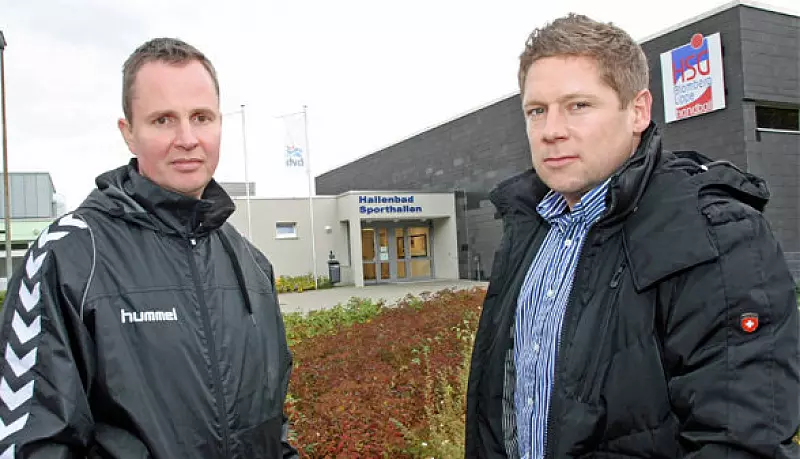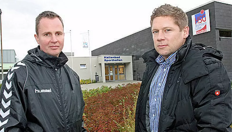 HSG-Bundesligatrainer André Fuhr und HSG-Geschäftsführer Torben Kietsch (rechts) schauen sich die derzeit gesperrte Halle I an der Ulmenallee an. Ein Ausbau ist für den Bundesligabetrieb notwendig. (© Foto: Bockwinkel)