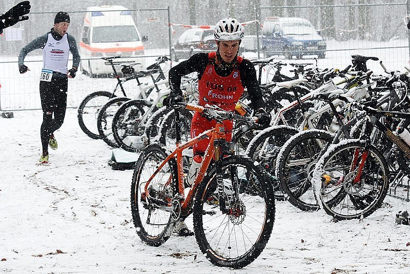 Lage (dw). Prächtig gelaufen und geradelt: Beim 8. Lagenser Cross-Duathlon hat trotz widriger Witterungsbedingungen beste Stimmung geherrscht. Bei den NRW-Meisterschaften siegte zwar mit Mathias Frohn (Foto, rechts) aus Schleiden ein Auswärtiger, doch als bester Lipper kam Clemens Coenen (TV Lemgo; Foto, links) nach fünf Kilometern Laufen, 16 Kilometern Radfahren und noch einmal fünf Kilometern Laufen als Fünfter ins Ziel.