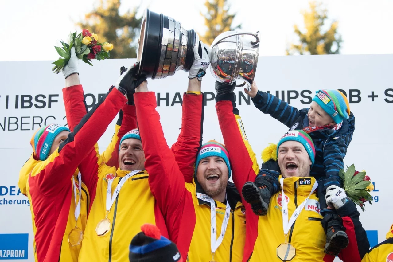 Altenberg - Mit seinem Sohn auf den Schultern nahm Bob-Pilot Francesco Friedrich bei der Siegerehrung ganz in Ruhe seinen neunten WM-Pokal entgegen.