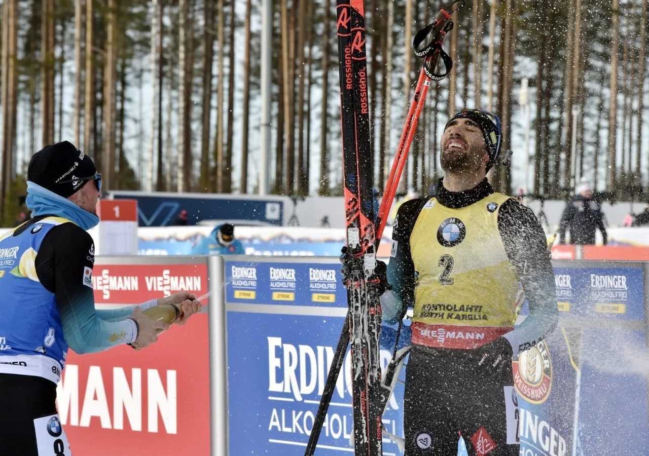 Kontiolahti - Nach dem 79. Weltcupsieg seiner eindrucksvollen Karriere genoss Frankreichs Biathlon-Superstar Martin Fourcade die Champagner-Dusche und die Gratulationen seiner Kontrahenten.
