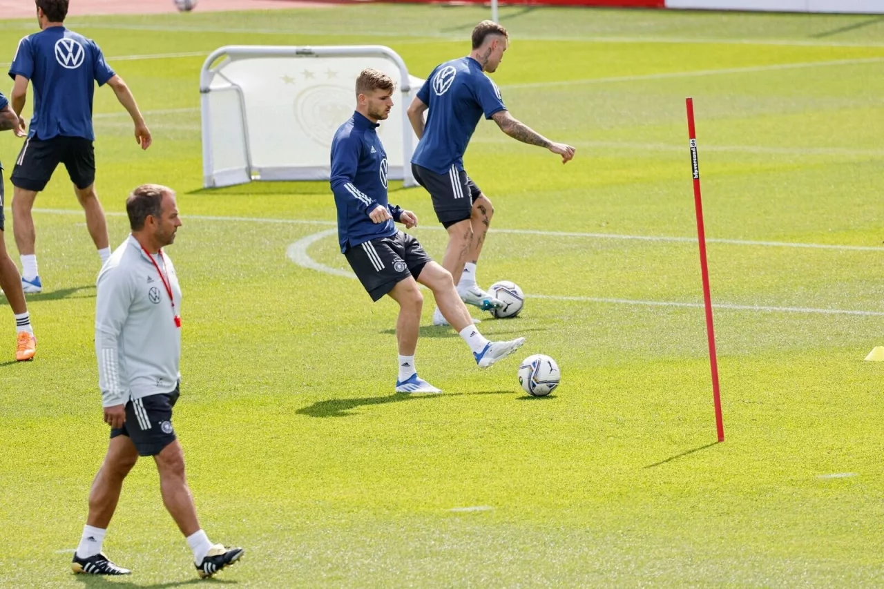 Der DFB-Kader trainierte in zwei Gruppen. Schwerpunkt war Standard-Training mit Spezialcoach Mads Buttgereit. Freistöße und Eckbälle genießen unter Flick einen besonderen Stellenwert. Spiele werden - gerade auch in der K.o.-Phase bei Turnieren - häufig durch Tore nach ruhenden Bällen entschieden. Buttgereit gibt den Input.