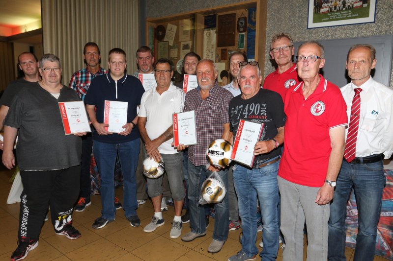 Hartmut Tegeler, Vorsitzender des Kreis-Fußballauschusses, und Staffelleiter Reiner Dobrott zeichnete folgende Vereine mit der Meisterurkunde und einem Fairplay-Ball aus: