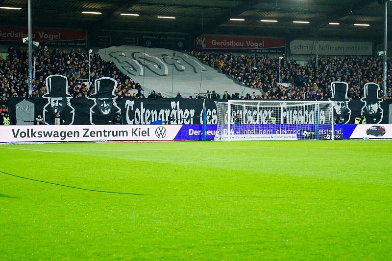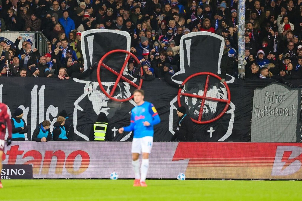 Dem Aufsteiger aus Schleswig-Holstein dürften nach dem umstrittenen Fanplakat mit der Aufschrift «Totengräber des deutschen Fußballs» und den Konterfeis von Klopp, Oliver Mintzlaff, Hoffenheims Mäzen Dietmar Hopp und Hannovers Macher Martin Kind Sanktionen durch den Deutschen Fußball-Bund drohen.