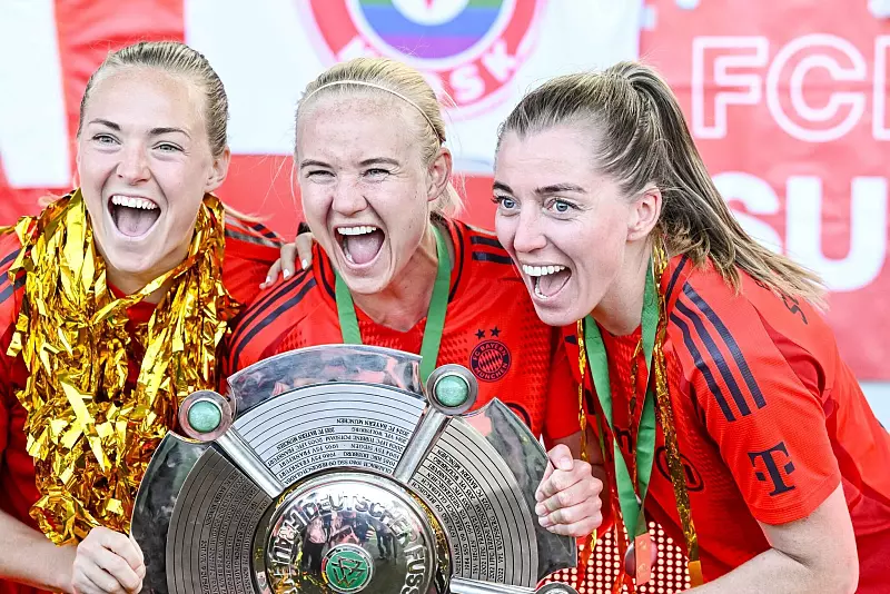 Drei Jahre lang spielten sie gemeinsam beim FC Chelsea, seit 2023 tragen sie das Bayern-Trikot und holten in der abgelaufenen Saison das Double. Seit 2014 sind Harder und Eriksson schon ein Paar. Im Februar schüttelten sie sich bei einem Nations-League-Spiel als Kapitäninnen ihrer Nationalteams die Hand. Während der Partie bekam Harder dann einmal sogar den Ellbogen ihrer Partnerin ins Gesicht.