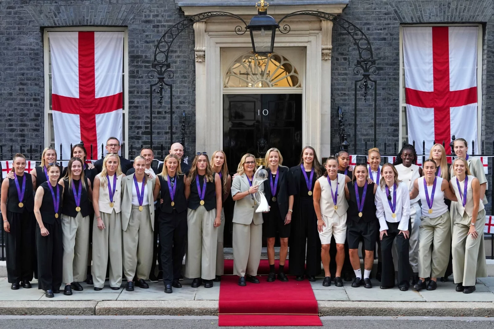 Nach einem stimmungsvollen Empfang am Flughafen durch die Fans sind Englands Fußballerinnen für ihren EM-Triumph von der Regierung an der Downing Street geehrt worden. Der Rote Teppich vor der offiziellen Residenz des britischen Premierministers in London war ausgerollt, die Fenster mit England-Fahnen behängt.