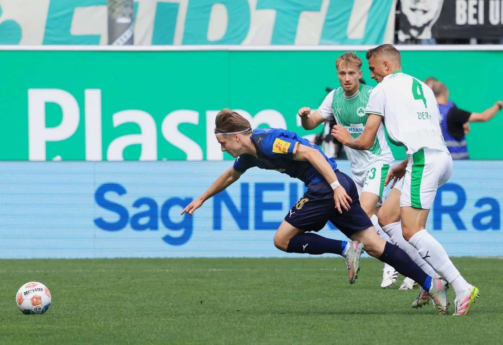 Nach einem verpatzten Saisonstart hat Holstein Kiel den ersten Sieg in der 2. Fußball-Bundesliga eingefahren. Bei der SpVgg Greuther Fürth gewannen die Gäste eine über weite Strecken enge Partie mit 2:0 (1:0). Neuzugang Jonas Therkelsen brachte den Bundesliga-Absteiger in der 31. Minute auf Erfolgskurs. Tief in der Nachspielzeit erhöhte John Tolkin (90.+5) nach einem Konter mit einem Schuss ins leere Fürther Tor.