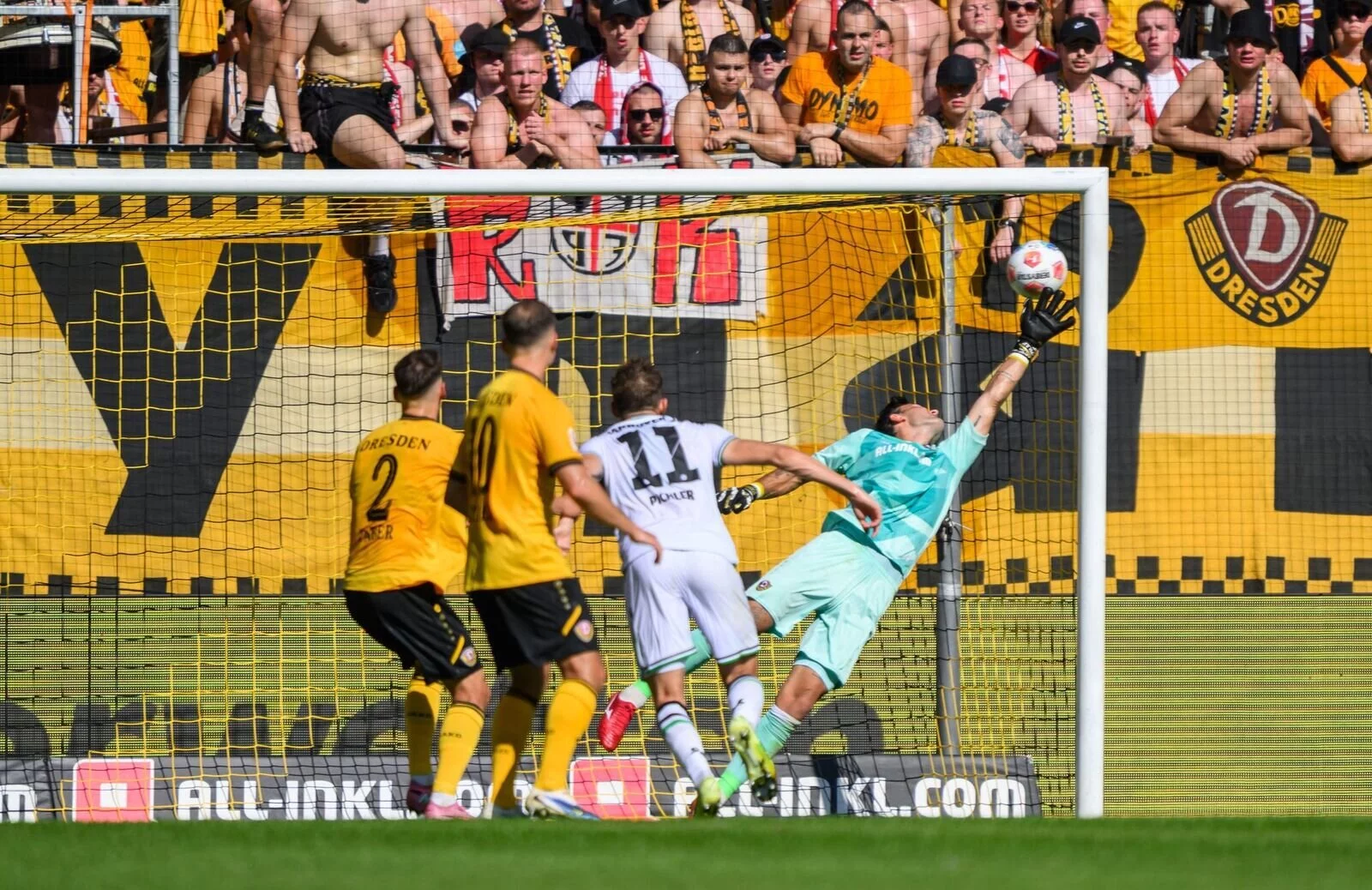 Benedikt Pichler hatte die Gäste vor 31.733 Zuschauern nach elf Minuten in Führung gebracht. Er verwandelte einen Handelfmeter. Virgil-Eugen Ghitä (35.) sorgte mit einem Eigentor für den Ausgleich, Nils Fröling (41.) erzielte mit seinem ersten Dynamo-Tor sogar die Führung für Dresden. Doch Noel Aseko Nkili (43.) gelang noch vor der Pause der Ausgleich. Vinko Sapina, bis dahin einer der besten Dresdner, sah in der 54. Minute für ein Nachtreten gegen Enzo Leopold die Rote Karte.