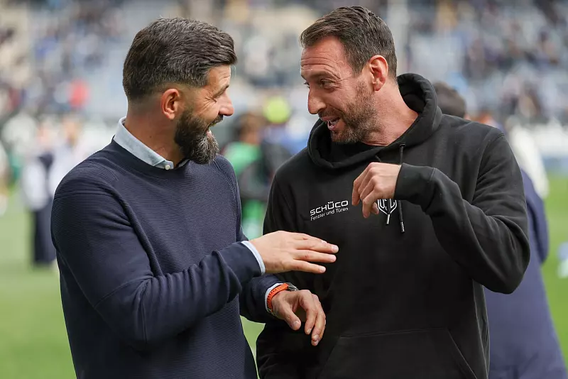 Trainer Miron Muslic (FC Schalke 04, l) und Trainer Mitch Kniat (Arminia Bielefeld, r). (© Friso Gentsch/dpa)