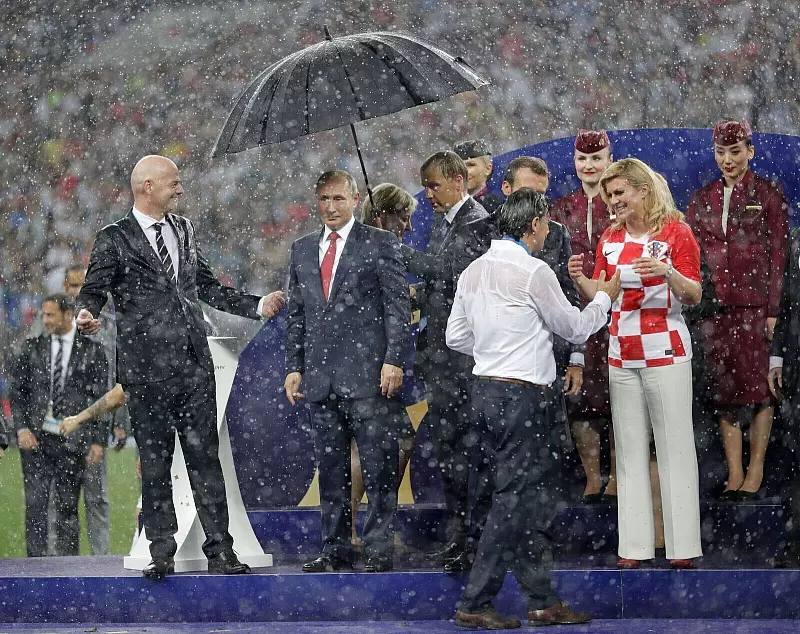 2018 war Russlands Präsident Wladimir Putin beteiligt. Dass dieser im Gegensatz zu Infantino im strömenden Moskauer Regen bei der Kür der französischen Weltmeister einen Regenschirm als Schutz bekam, sorgte vielfach für belustigte oder ironische Kommentare.