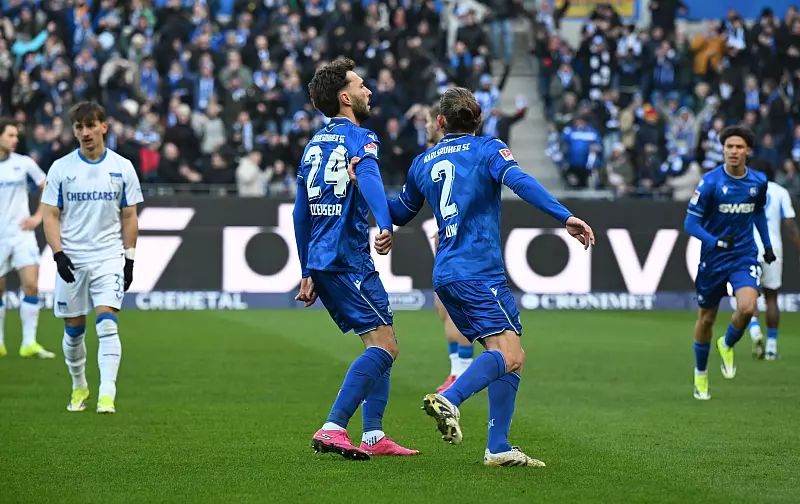 Begleitet von Solidaritätsbekundungen auf den Rängen nach den Gewaltvorfällen zwischen Fans und der Polizei vor einer Woche beim Spiel der Berliner gegen den FC Schalke 04 (0:0) sorgten beide Teams von Beginn an für Unterhaltung auf dem Feld. Fabian Schleusener (7. Minute) brachte die Gastgeber vor 33.180 Zuschauern früh in Führung, ehe Hertha-Kapitän Fabian Reese (20.) beim zwischenzeitlichen Ausgleich von einem eklatanten Fehler im Spielaufbau von Karlsruhes Marvin Wanitzek profitierte.