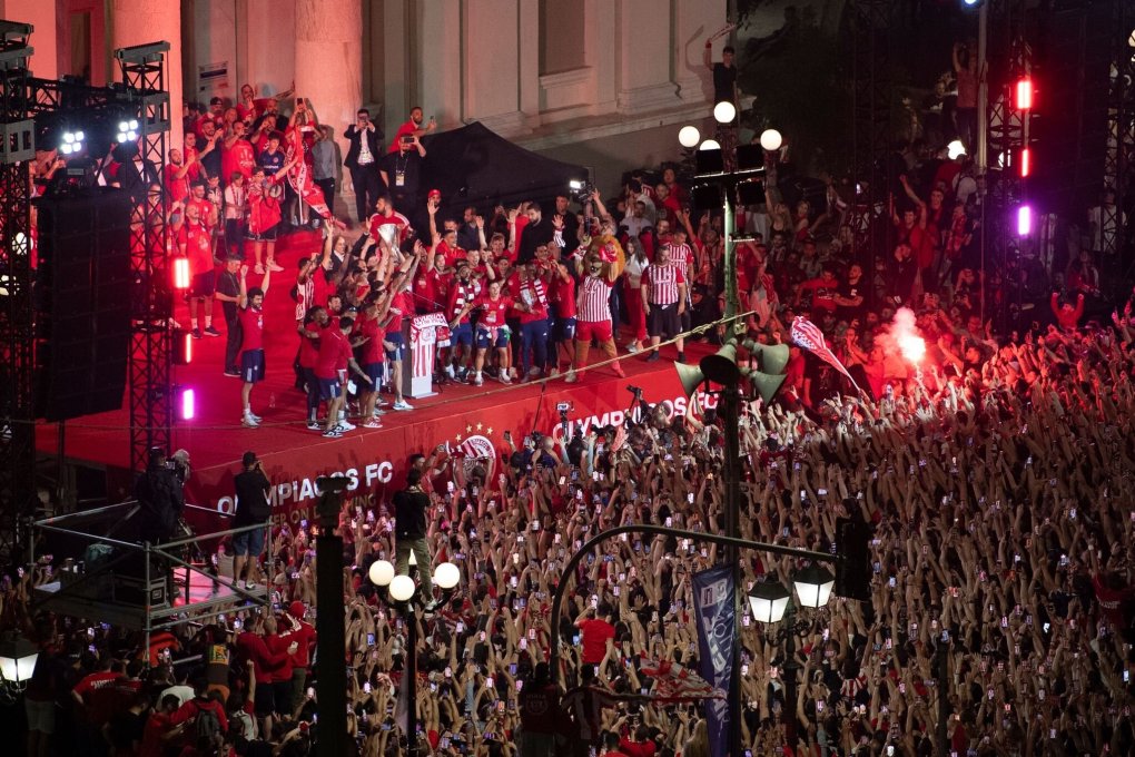 «Fieberwahn überall», titelte die griechische Sportzeitung «Protathlitis». Die Feierlichkeiten erreichten ihren Höhepunkt, als die Mannschaft von Olympiakos den zentralen Platz von Piräus erreichte. Dort hatten nach Schätzungen der Polizei rund 30.000 Fans auf einem großen Bildschirm das Finale verfolgt. Viele waren bereits zehn Stunden vor Beginn des Spiels zum Platz vor dem Rathaus gegangen, um sich eine gute Sicht zu sichern.