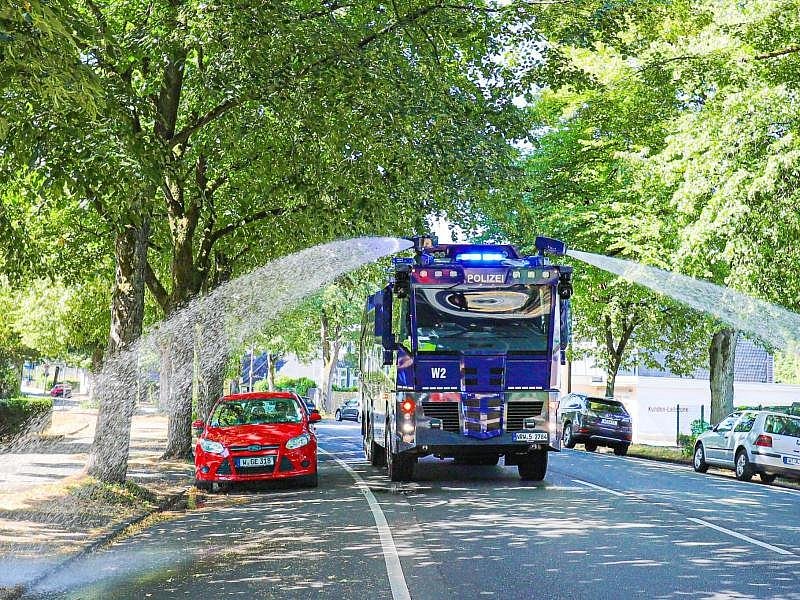In Wuppertal führen die heißen Temperaturen und anhaltende Dürre zu außergewöhnlichen Maßnahmen: Ein Wasserwerfer der Polizei hilft, Bäume in der Stadt zu bewässern. (© Foto: Claudia Otte) In Wuppertal führen die heißen Temperaturen und anhaltende Dürre zu außergewöhnlichen Maßnahmen: Ein Wasserwerfer der Polizei hilft...