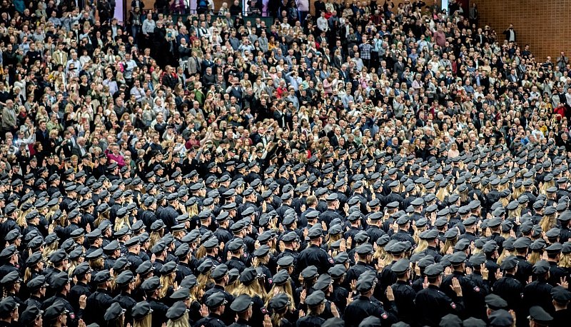 Volles Haus: Unter den Augen von Familie und Freunden heben Polizeianwärter bei einem Festakt in Hannover die Hand zur Vereidigung. (© Foto: Hauke-Christian Dittrich/dpa) Volles Haus: Unter den Augen von Familie und Freunden heben Polizeianwärter bei einem Festakt in Hannover die Hand zur Vereidigung. Foto: Hauke-Christian Dittrich/dpa