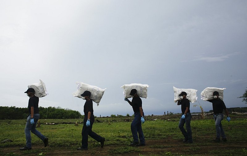 Polizisten tragen Säcke mit beschlagnahmten Drogen, die während einer Entsorgungsaktion an der Mündung des Bayano River in Panama zerstört werden sollen. Insgesamt wurden mehrere Tonnen Kokain, Marihuana und synthetische Drogen vernichtet. (© Foto: Arnulfo Franco/AP/dpa) Polizisten tragen Säcke mit beschlagnahmten Drogen...