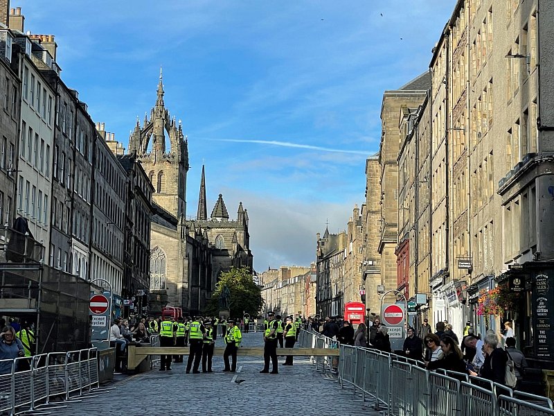 Seit dem frühen Morgen harren Tausende Schottinnen und Schotten vor den Absperrgittern an der Royal Mile aus. Diese Königliche Meile sieht völlig anders aus als die Mall in London, die bombastische Prachtstraße, die nächste Woche beim Staatsbegräbnis der Queen mit riesigen Union Jacks geschmückt sein wird. Die Royal Mile ist relativ schmal, sie windet sich durch die mittelalterliche Altstadt von Edinburgh.