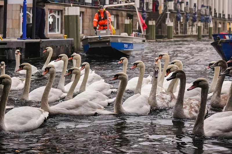 Schluss mit Schwimmen auf der Außenalster: Zahlreiche Hamburger Alsterschwäne sind am Dienstag wie geplant in ihr Winterquartier umgezogen. Schwanenvater Olaf Nieß und sein Team haben rund 30 Tiere am Mittag an der Rathausschleuse der Hansestadt eingesammelt und mit Booten zu ihrem Winterquartier gefahren. Wie auch schon im vergangenen Jahr müssen die Mitarbeiter viele der restlichen Höckerschwäne zudem in ihren weiter entfernten Brutplätzen suchen.