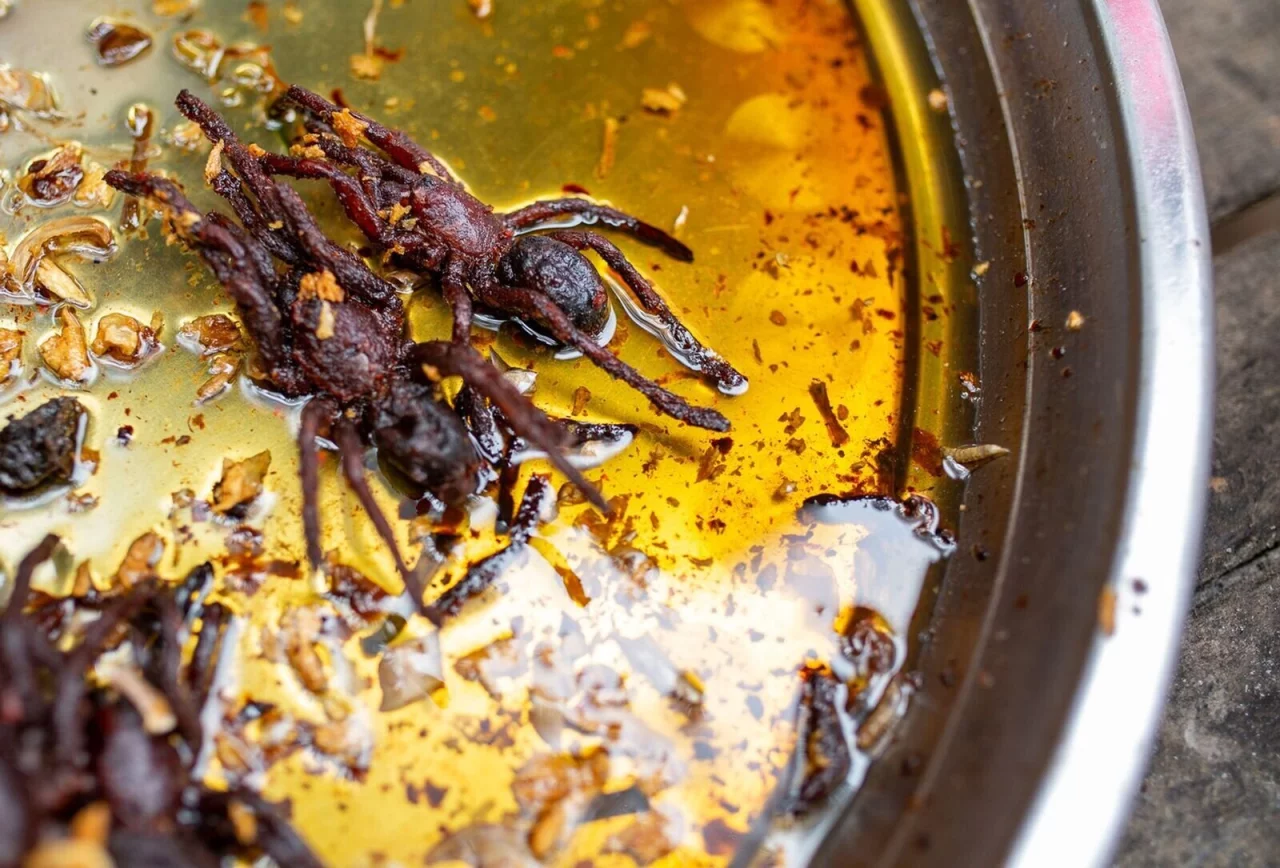 Ein Europäer schaut zögerlich auf das schwarze Ungetüm in seiner Hand. Dann fasst er Mut und beißt mit verzogenem Gesicht in eins der acht Spinnenbeine. Vorsichtig beginnt er auf dem knusprig frittierten Gliedmaß zu kauen, aber als es an den massigen Körper geht, gibt er auf.