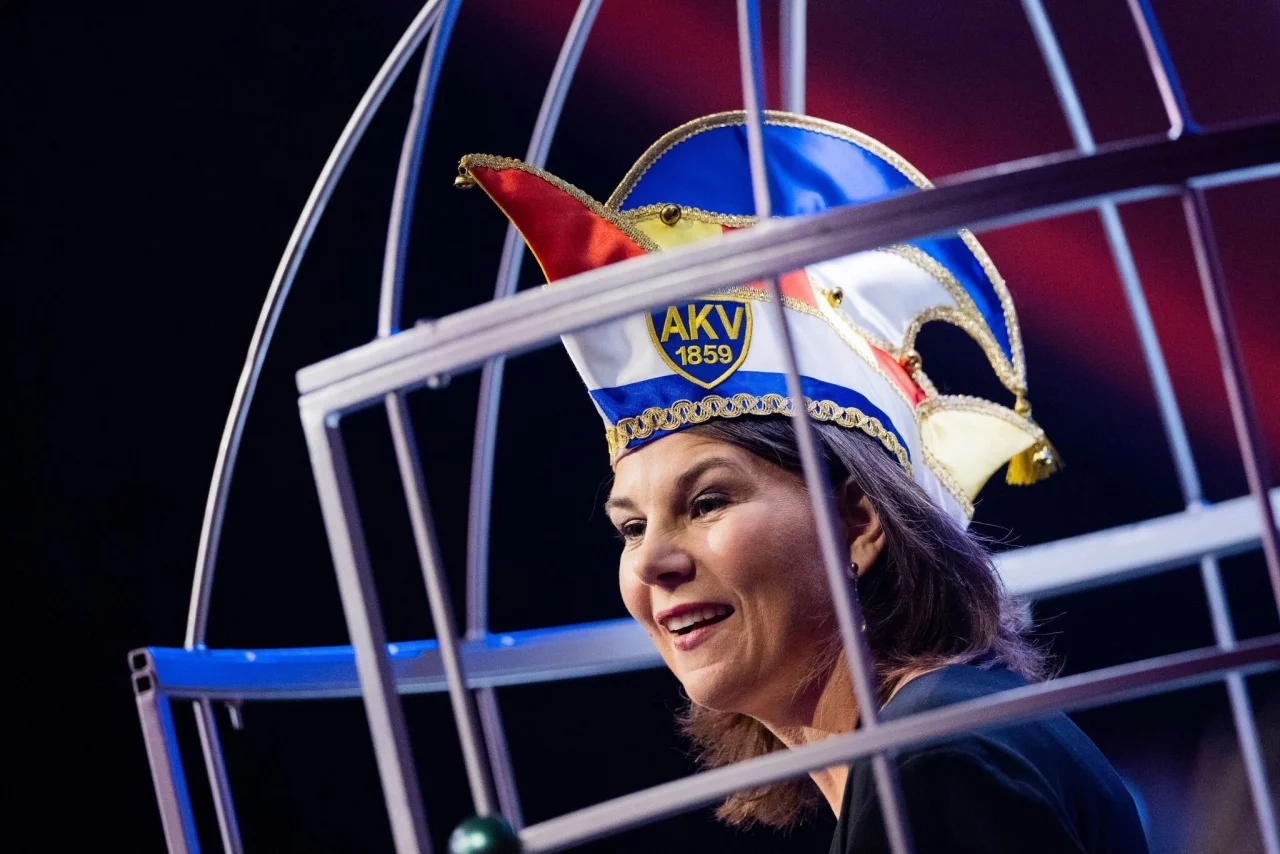 «Ich habe lange überlegt, was meine Verkleidung angeht», sagte Baerbock. Die Verkleidung als Leopard schied aus - sie habe Sorge gehabt, dass das Kanzleramt keine Reisegenehmigung erteile, sagte die Außenministerin mit Augenzwinkern. Sie trug einen schwarzen Hosenanzug und die Narrenkappe.