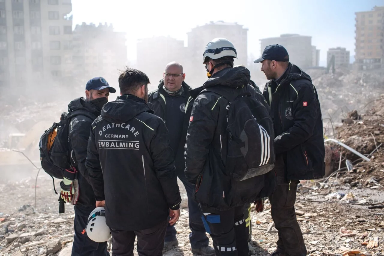 Zwei Wochen nach dem Erdbeben gibt es kaum noch Hoffnung, hier noch jemanden lebend zu finden. Stawinski ist für die gekommen, die in den Trümmern gestorben sind. Der 48-Jährige aus Sachsen-Anhalt leitet ein Team von zwölf Bestattern aus Deutschland. Deathcare heißt ihre ehrenamtliche Organisation mit Sitz im rheinland-pfälzischen Wörth. Sie hilft bei der Bergung von Leichen und bereitet sie für die Beerdigung vor.
