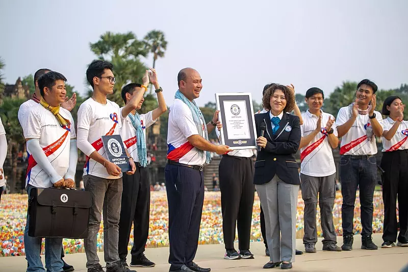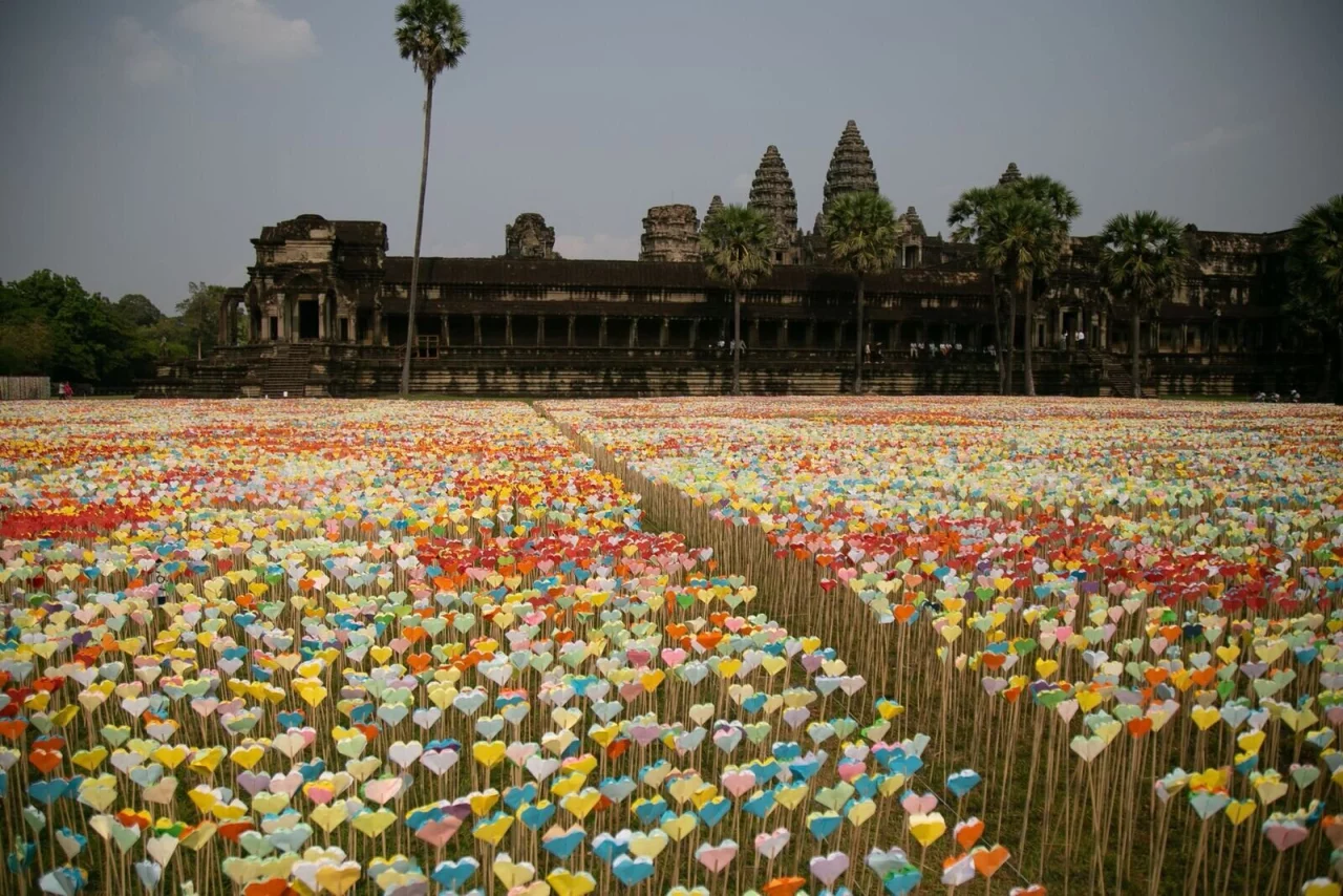 Millionen von Papierherzen vor der berühmten Tempelanlage Angkor Wat in Kambodscha: Mit dieser Aktion hat es das südostasiatische Land ins Guinness-Buch der Rekorde geschafft. Insgesamt seien 3.917.805 Herzen im Origami-Stil gefaltet und aufgestellt worden, bestätigten die Juroren. Damit habe das Land den bisherigen Rekord von 2019 deutlich überholt: Damals waren in Großbritannien 53.704 Origami-Herzen gefaltet worden.