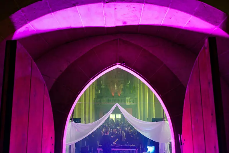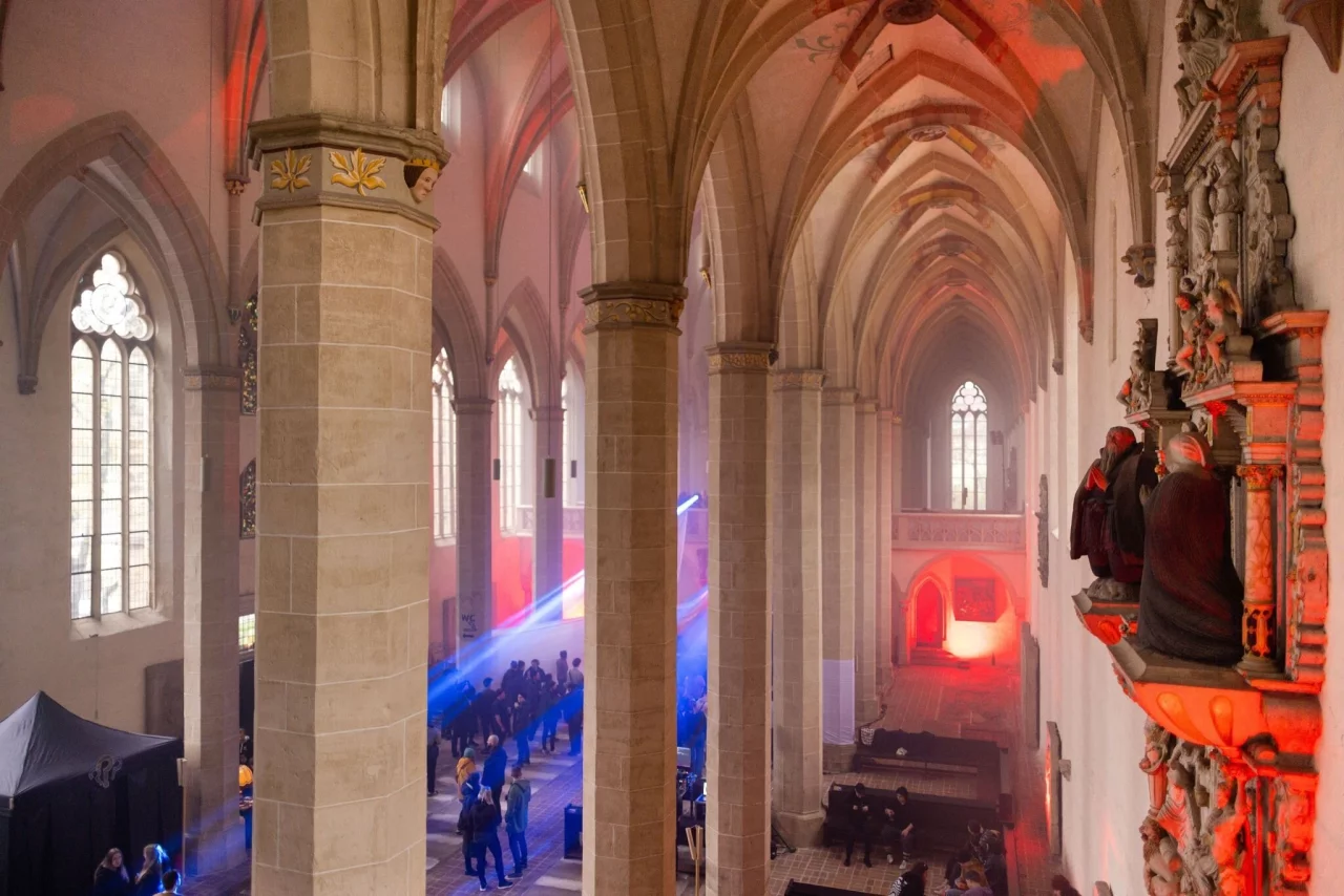 In dem mehrere Hundert Jahre alten Gotteshaus wurden für eine große Tanzfläche die Bänke zur Seite gerückt. Eine LED-Wand mit Animationen sorgte für Club-Atmosphäre. Die Tanzparty wurde gemeinsam mit der Evangelischen Jugend und dem Nachtclub «Kalif Storch» ausgerichtet.