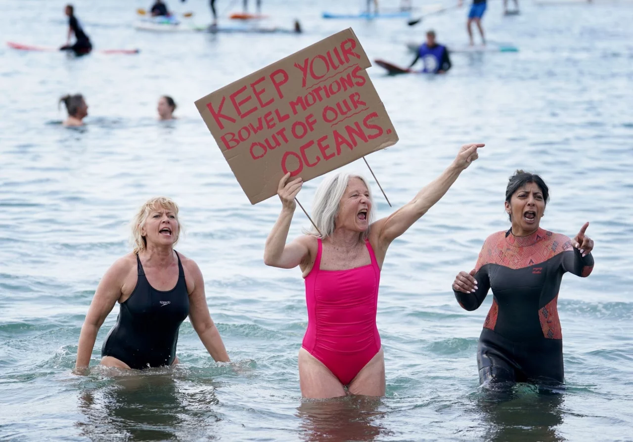 In den beliebten Badeorten Brighton und Falmouth in Südengland sowie im nordostenglischen Scarborough, nahe der schottischen Hauptstadt Edinburgh, und auch in Nordirland gingen Schwimmerinnen und Schwimmer ins Meer. Auf Schildern forderten sie unter anderem: «Lasst Eure Darmbewegungen aus unseren Ozeanen!»