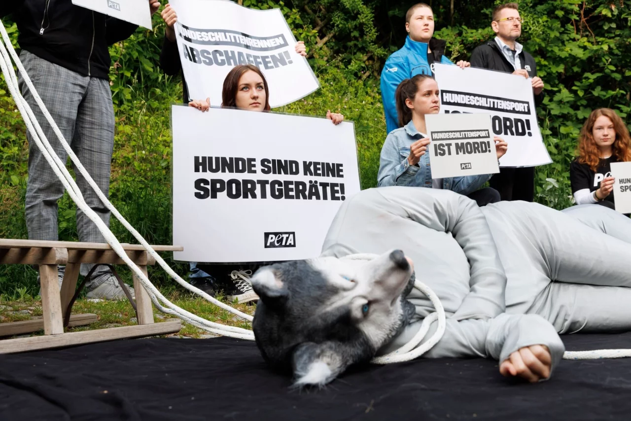 Mit einem Fuß steht der Sensenmann auf einem Schlitten, in der einen Hand die Sense in der anderen eine Leine, vor ihm drei tote Huskys: So haben Aktivisten der Tierschutzorganisation Peta am Dienstag vor dem Amtsgericht Calw protestiert, wo eine Hundehalterin sich nach dem Tod von zwölf Schlittenhunden verantworten musste. Das Amtsgericht verurteilte die Frau wegen Verstoßes gegen das Tierschutzgesetz zu einer Geldstrafe von 90 Tagessätzen zu je 50 Euro.