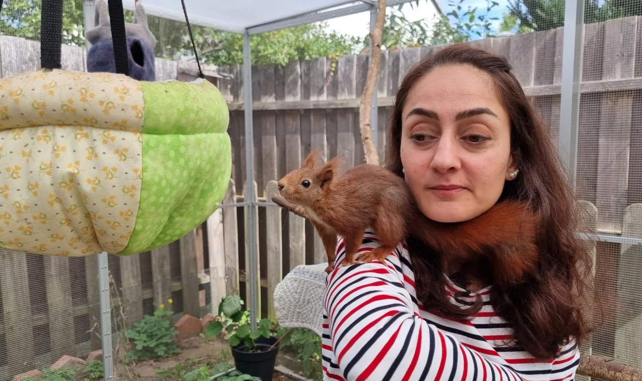 7 der aktuell 13 kleinen Mitbewohner leben bereits draußen. Zunächst in einer Außenvoliere auf Gharibs Grundstück, danach in einer größeren Voliere an einem geheimen Ort im Wald. 64 Eichhörnchen hat Mona Gharib bisher allein in diesem Jahr aufgenommen, ihr Mann unterstützt sie bei der Aufzucht. Insgesamt waren es in den vergangenen drei Jahren geschätzte 150 Tiere. «Eines von ihnen als "Bleibehörnchen" zu behalten, kam mir nie in den Sinn», betont sie.