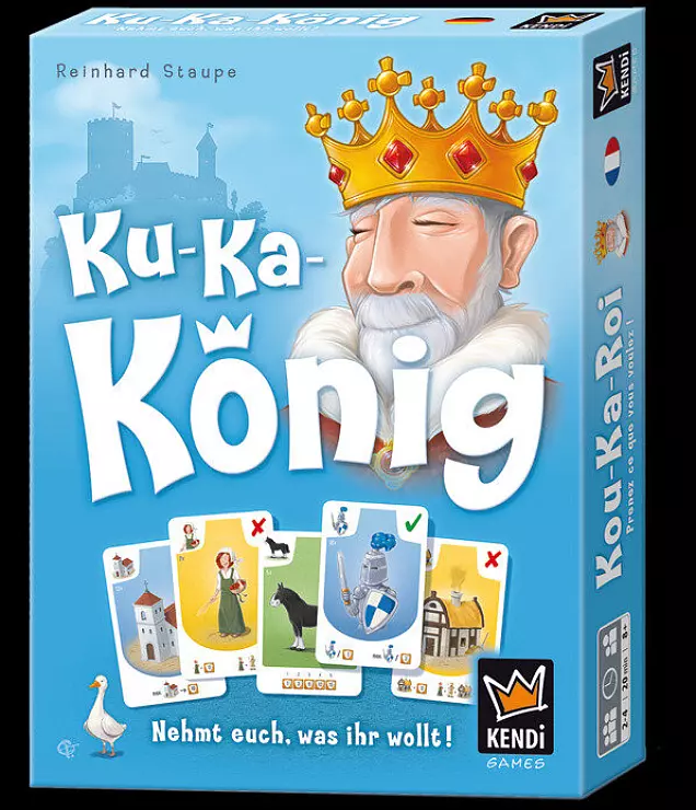 Im ungewöhnlichen „Ku-Ka-König“ baut man ein eigenes Königreich. In jeder Runde gibt es dafür neue Karten. In acht Spalten liegen die aus: Könige und Ritter, Bauern, Kirchen und Tiere. Je mehr man von einer Sorte sammelt, desto besser. Und das geschieht recht witzig: Alle zeigen gleichzeitig mit den Fingern an, welche Spalte sie haben wollen. Wer eine allein wählt, schnappt sich die Karten. Die anderen müssen dagegen neu zocken. So wird viel gejubelt und gelacht.