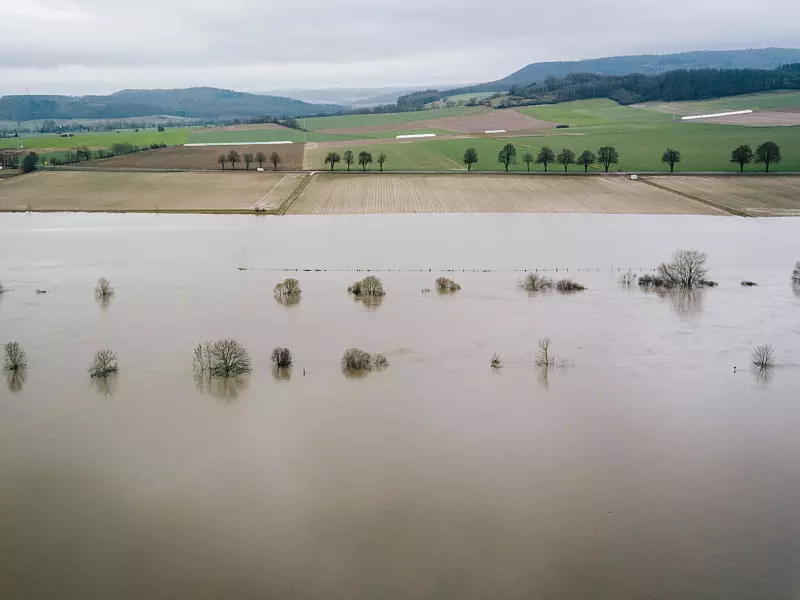 Wiesen und Felder werden vom Hochwasser der Weser überflutet. (© Ole Spata/dpa)