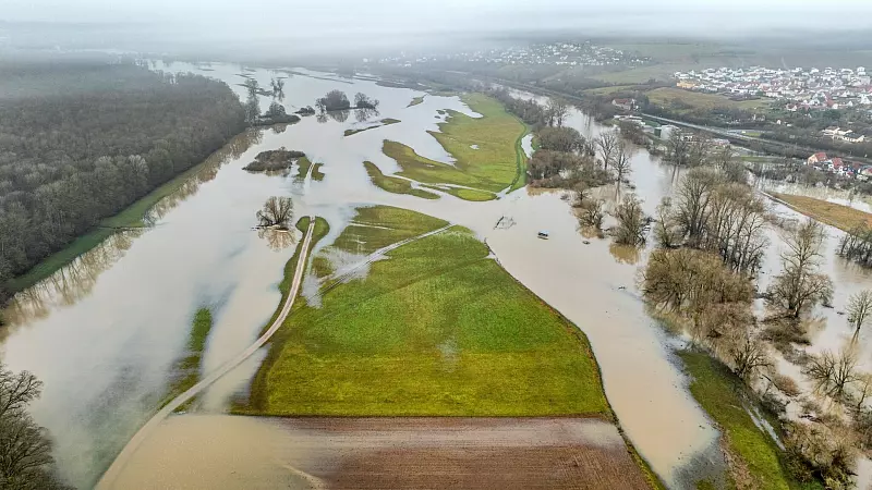 Der über die Ufer getretene Main überflutet Wiesen und Felder bei Haßfurt. - © René Ruprecht/dpa