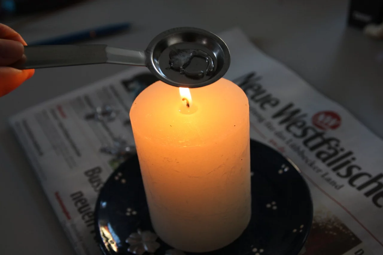 Eine kinderfreundliche Variante: Kerzenwachs. Das Wachs verhält sich anders als Zinn und bleibt teilweise flach an der Wasseroberfläche oder zerbricht, wenn es aus dem Wasser gefischt wird.