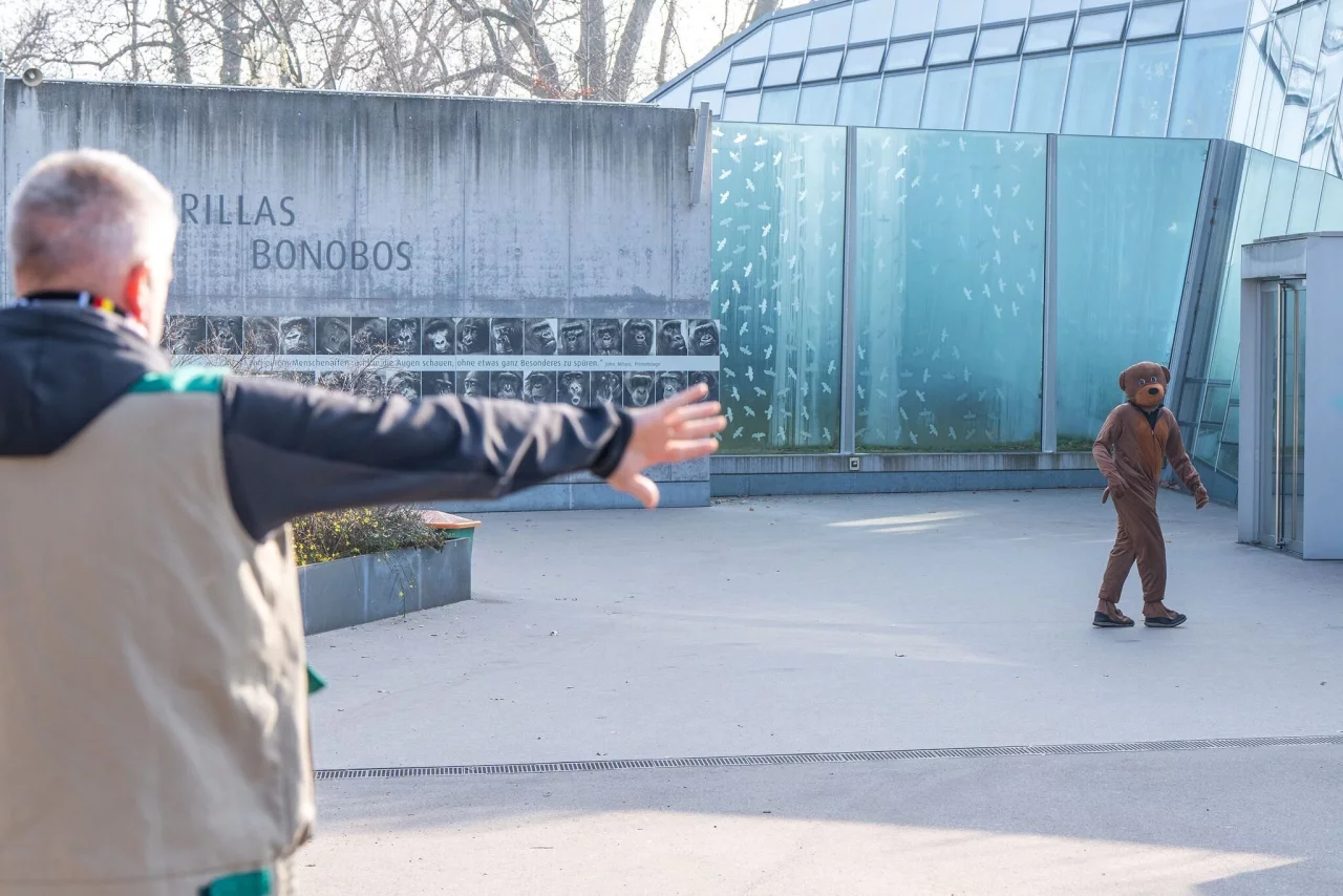 Teil des Ablaufs sei die sofortige Einberufung eines Krisenstabs aus Tierpflegern und Tierärzten. Der betroffene Bereich der Wilhelma musste evakuiert und abgesperrt werden. Der Mensch im Bärenkostüm sei binnen weniger Minuten entdeckt und gestellt worden. Im Ernstfall hätte man das Tier mit einem Pfeil aus einem Blasrohr narkotisiert.