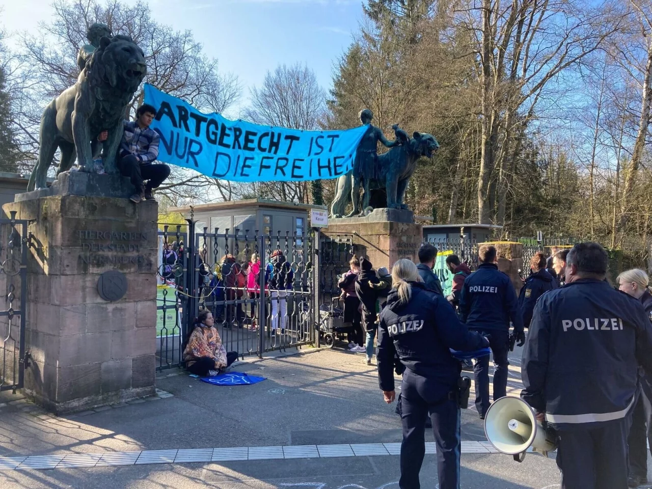 Tierschutzaktivisten haben am Samstag den Eingang des Nürnberger Tiergartens blockiert. Mit der Aktion richteten sie sich gegen eine geplante Tötung von Pavianen des Zoos. Wie eine Sprecherin der Polizei mitteilte, hatten sich am Morgen 24 Aktivisten vor den Haupteingang des Zoos gesetzt, fünf hatten sich zudem mit massiven Eisenketten an ein Tor gekettet. Am Eingang befestigten die Aktivisten ein Banner mit der Aufschrift «Artgerecht ist nur die Freiheit» und riefen über ein Megafon Parolen wie «Du bist nicht allein».