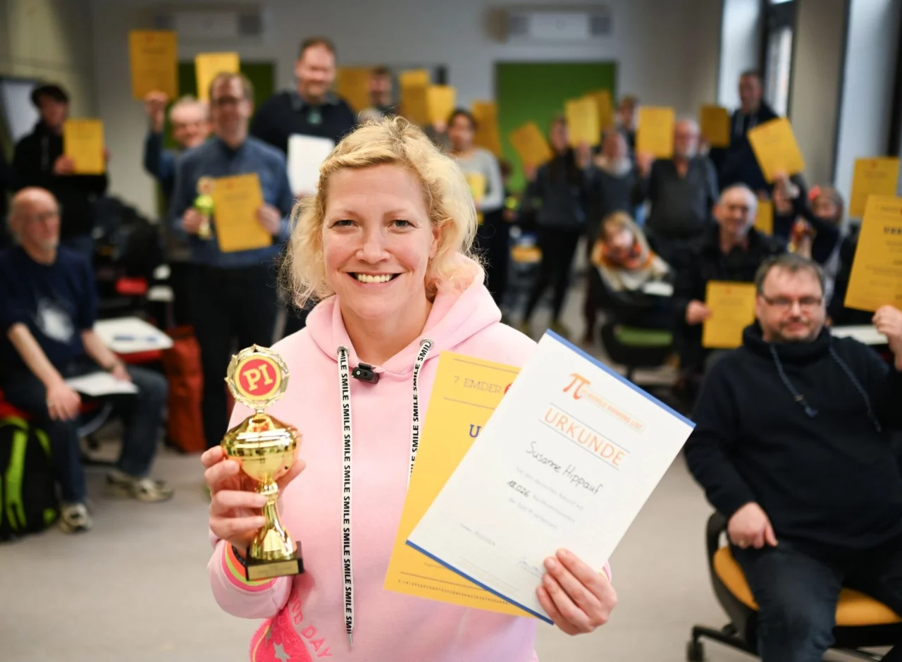Bei der deutschen Meisterschaft im Aufsagen der Kreiszahl Pi ist in Emden ein neuer Rekord aufgestellt worden. Die Frankfurter Gedächtniskünstlerin Susanne Hippauf schaffte es, die Zahl aus dem Kopf auf 18.026 Nachkommastellen aufzusagen und brach damit ihren eigenen nationalen Rekord um mehr als 2500 Stellen. Dafür benötigte die Polizistin drei Stunden und fünf Minuten.