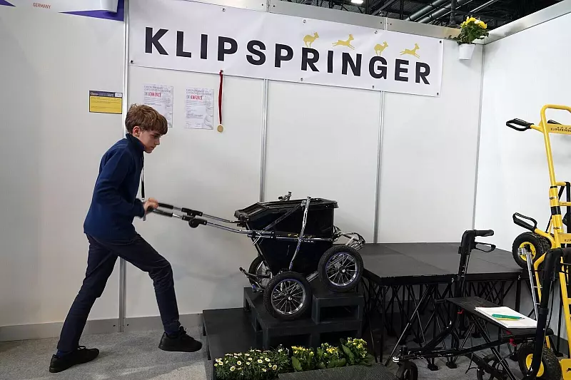 Eine Mutter hat sich in München mit Kinderwagen und Einkäufen in einem Altbau an den Treppen abgemüht. Was tun? Eine Gruppe Freunde entwickelte eine mobile Radachse mit Feder. So können Lasten auf Rädern oder ein Kinderwagen mit ein bisschen Hebelkraft mühelos die Treppe hinaufklettern, sagt Marie-Louise Boisseau, die zum Freundeskreis gehört. Ihr Sohn Rafael (10) demonstriert, dass es kinderleicht ist: Die vorderen Räder schieben sich beim Anstoß an die nächste Stufe nach hinten. Dann wird der Griff des Gefährts heruntergedrückt, um die Räder auf die nächste Stufe zu bringen und dort fahren sie dank der Feder wieder aus. Das System funktioniert auch mit Rollator an der Bordsteinkante, wie Boisseau zeigt. Das Patent ist da, die Tochter der Frau mit dem Kinderwagenproblem, Clara Sant'Unione (18), will es im Lizenzverfahren vermarkten.