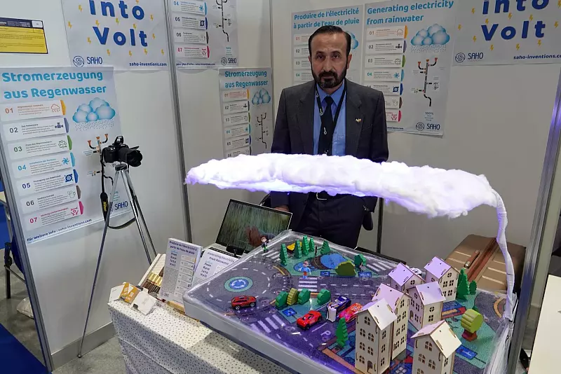 Khaled Al-Saho (48) aus Lübeck will Energie mit Regenwasser erzeugen. Der Syrer, freischaffender Erfinder, wie er sagt, hat in Genf eine Miniaturstadtszene aufgebaut, mit Watte als Wolke, um zu demonstrieren, wie das geht: Das von den Straßen ablaufende Wasser soll in seinem System unterirdisch aufgefangen werden und in abschüssigem Gelände kleine Turbinen antreiben. Der Strom könne etwa in Säulen zum Aufladen von Elektroautos gespeist werden.