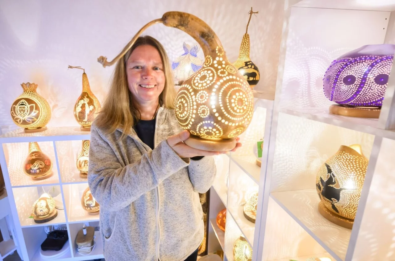 Für die Lampenkünstlerin, selbstständig, sind Kalebassen eine Herzensangelegenheit und Lebensinhalt - auch wenn sie damit keine Familie ernähren wollen würde. «Ich bin sehr kreativ geworden und fühle mich als Künstlerin», sagt sie. Mit kleinen Bohrern bearbeitet sie die getrockneten Kürbisse, die hart sind wie Holz. Aus vielen kleinen Löchern entstehen Muster und Bilder, oft Tiere, gerne Katzen - denn: «Katzen gehen immer.»