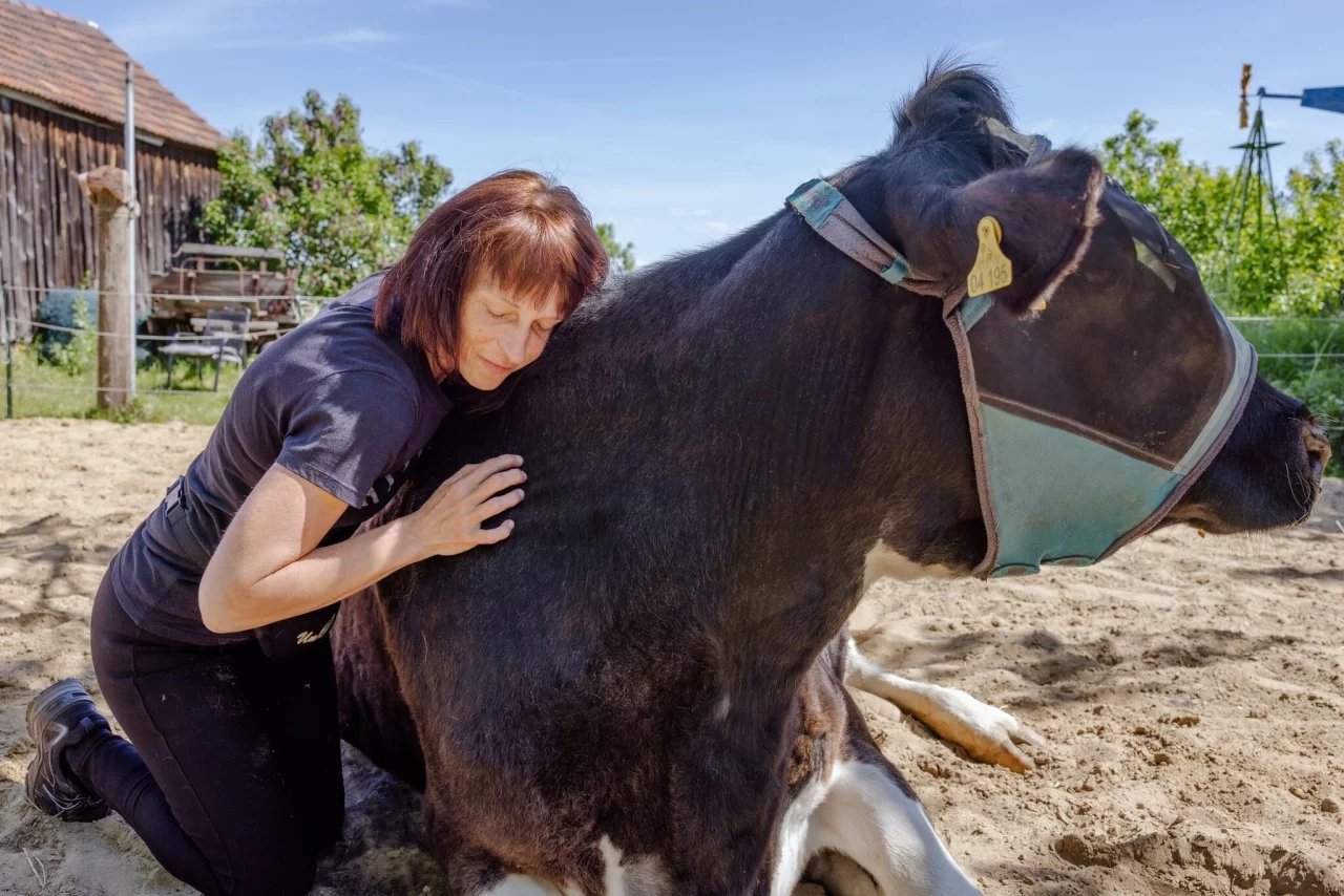 Kuscheln mit Kühen, die sonst aus der Ferne auf den Weiden zu sehen sind und zur Milch- oder Fleischproduktion gehalten werden? Die Agrarwissenschaftlerin und Therapeutin Jessica Exner bietet das auf ihrem «Hof der Verbundenheit» im südbrandenburgischen Dörfchen Wildenau bei Schönewalde an. «Ich bin halt ein totaler Rinderfan», sagt sie. Auch bei Melanie John, die in Dresden lebt, sind Berührungsängste schnell verflogen, als sie zum Kuscheln an Monty heranrückt.