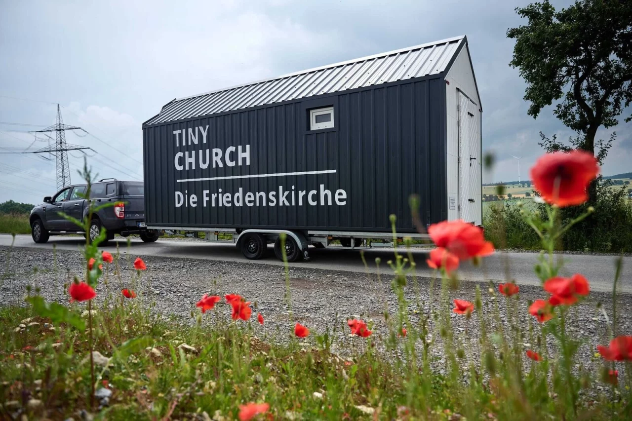 Die mobile Kirche mit einem Fensterkreuz und der Aufschrift «Tiny Church - Die Friedenskirche» ist ein Hingucker. Als Initiative des Kolping Schulwerks in Paderborn hat sie einen festen Standort auf einem Kolping Gutshof im Kreis Höxter. Dort wird die XS-Kirche für die pädagogische Arbeit mit Kindern und Jugendlichen genutzt.