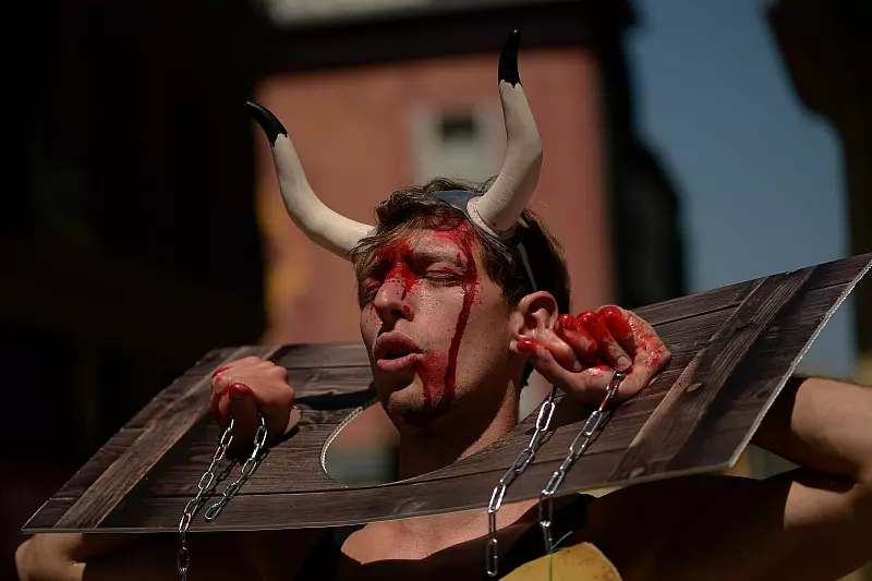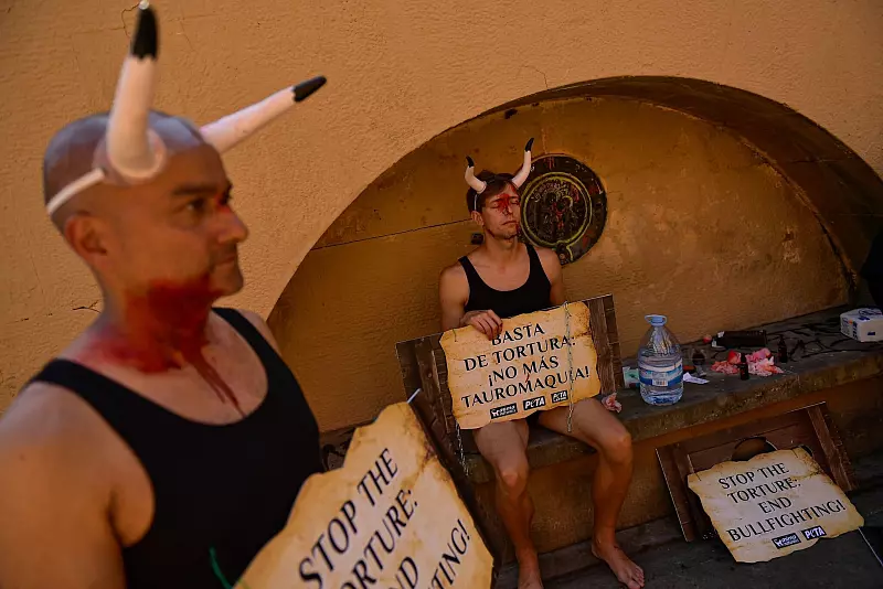 Einige Demonstranten gingen am Freitag am Pranger angekettet, trugen Hörner und hatten sich Gesichter und Hände mit roter Farbe bemalt. Diese sollte das Blut der rund 20.000 Stiere symbolisieren, die jedes Jahr bei den verschiedenen Veranstaltungen mit jahrhundertelanger Tradition in Spanien getötet werden.