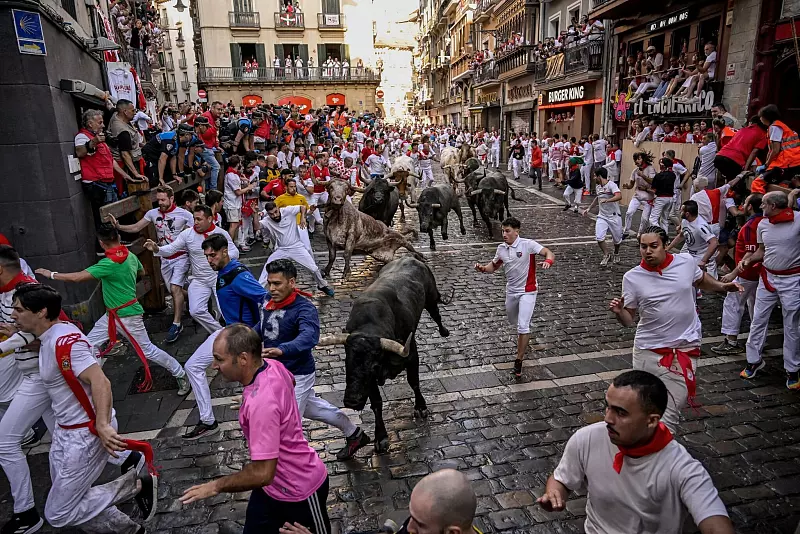 Die Stierhatz ist aber zweifellos der Höhepunkt der Festivitäten: Zwischen dem 7. und 14. Juli werden stets morgens um acht Uhr jeweils sechs zum Teil über 600 Kilogramm schwere Kampfbullen und auch mehrere Leitochsen von Hunderten Menschen durch enge Gassen in die Arena gejagt, wo sie am Abend bei Stierkämpfen getötet werden. Das Staatsfernsehen und andere TV-Sender übertragen bis zum Ende der Festivitäten live. Es gibt zudem Sondersendungen, Millionen in ganz Spanien sitzen gebannt vor den Schirmen.