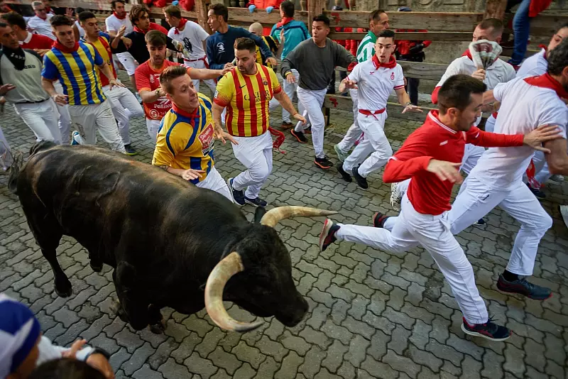 Das Fest zu Ehren des Stadtheiligen San Fermín hatte am Samstag begonnen und endet kommenden Sonntag. Täglich werden ab 8.00 Uhr sechs, um die 600 Kilogramm schwere Kampfbullen unter Führung zahmer Leitochsen durch die engen Gassen der Altstadt bis in die große Stierkampfarena getrieben. Bei den Mutproben der vorwiegend jungen Männer werden jedes Jahr Dutzende Läufer verletzt. Seit 1924 gab es 16 Todesopfer, das letzte 2009. Die Stiere sterben später bei Stierkämpfen.