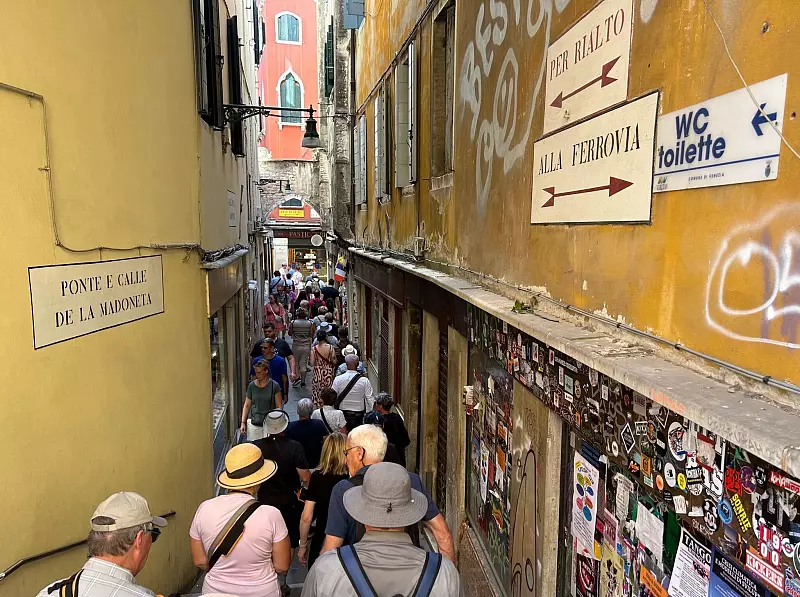 Mit geschätzt etwa 15 Millionen Gästen pro Jahr gehört Venedig zu den meistbesuchten Städten der Welt. Der Massentourismus bringt viel Geld in die Kassen, richtet aber auch erhebliche Schäden an. Heute leben im Zentrum mit seinen Hunderten Kanälen keine 50.000 festen Einwohner mehr. Dafür gibt es mehr als 50.000 Gästebetten. An vielen Tagen ist in den engen Gassen rund um Markusplatz und Rialtobrücke kaum noch ein Durchkommen.